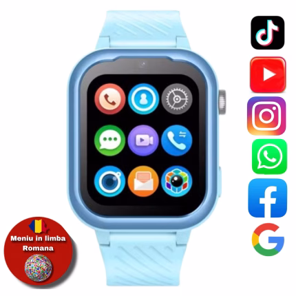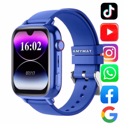 Ceas Smartwatch Pentru Copii AMYMAT KT15 PRO, 4G WhatsApp Argintiu, cu localizare GPS, apelare video, rezistent la apa si monitorizare spion tip telefon Albastru