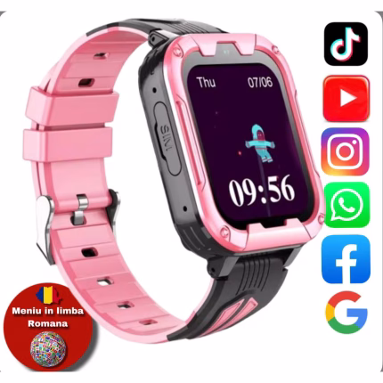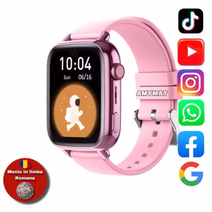 Ceas Smartwatch Pentru Copii AMYMAT Wonlex KT32 WhatsApp, Roz cu localizare GPS, apelare video, rezistent la apa si monitorizare spion 4G Meniu in limba Romana Deblocare Faciala