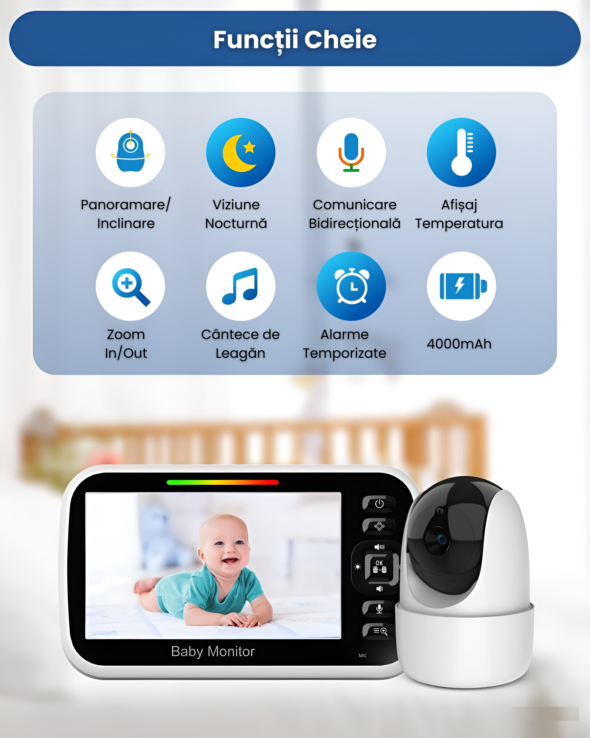 Baby Monitor cu Camera Audio-Video Wireless AMYMAT Pentru Supraveghere, Conexiune Privata, Senzor Temperatura, Two-way Talk, Cantece de leagan, Ajustabil, Bebe SweetDream – Alb VB801